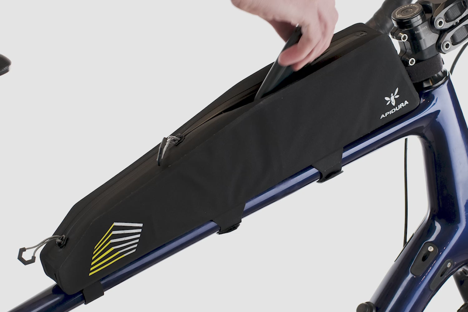 Designed for ultra-distance racing and gravel, the APIDURA RACING LONG TOP TUBE PACK 2 L Frame Bag offers an extended 2-liter capacity in a lightweight, streamlined format. It keeps your phone, snack or extra layer close at hand, while remaining perfectly stable on the bike. It's easy to open thanks to a fully waterproof, two-way zipper.