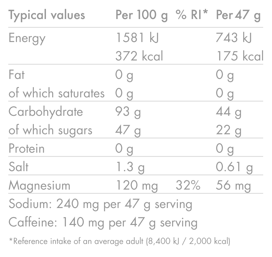 Το HIGH5 Caffeine HIT είναι ένα ισοτονικό ενεργειακό ποτό με υψηλή συγκέντρωση καφεΐνη (140 mg ανά μερίδα), σε συνδυασμό με αναλογία υδατανθράκων 2:1 και ηλεκτρολύτες. Είναι σχεδιασμένο για παρατεταμένη προσπάθεια όπου η πνευματική αντοχή και η εγρήγορση κάνουν τη διαφορά.