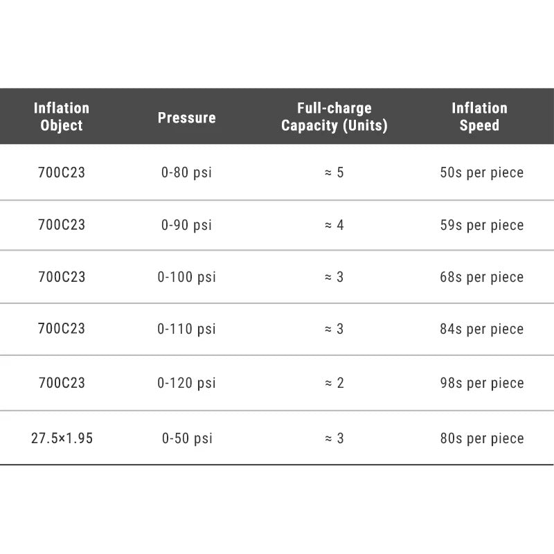 Avec une pression maximale de 120 PSI (≈ 8,3 bar), la EP01 est suffisamment puissante pour les pneus de vélo, VAE, certains scooters, mais aussi pour gonfler des ballons ou des bouées. Elle est compatible Presta, Schrader et valve aiguille, ce qui la rend universelle.