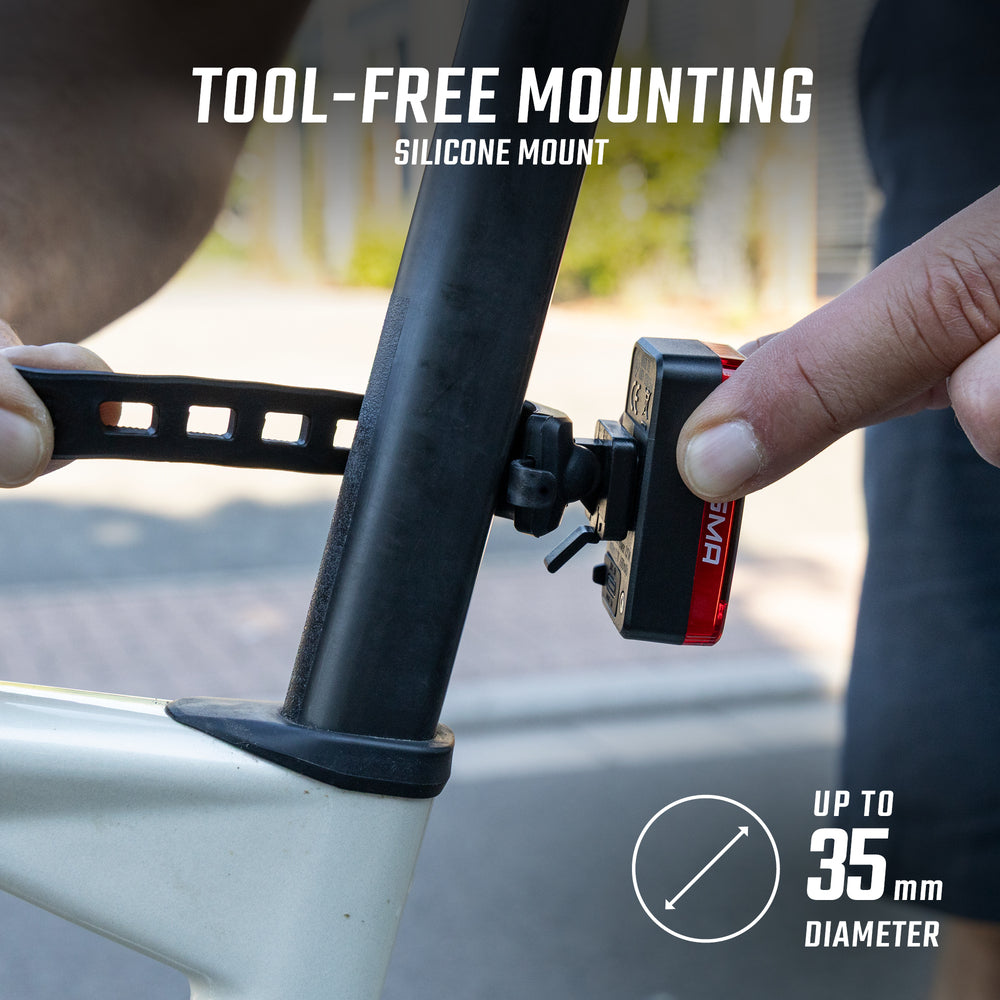Σχεδιασμένο για ποδηλάτες πόλης, αυτό το πίσω φως προσαρμόζεται γρήγορα σε οποιοδήποτε στύλο σέλας χάρη στη ζώνη σιλικόνης του, χωρίς την ανάγκη εργαλείων. Αδιάβροχο σύμφωνα με τα πρότυπα IP44, αντέχει στις πιτσιλιές νερού και θα σας συνοδεύει στις διαδρομές σας ανεξαρτήτως καιρικών συνθηκών.