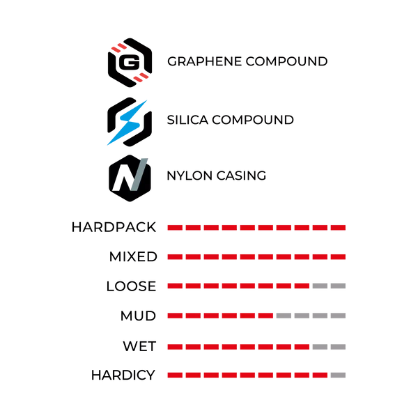 Το καουτσούκ 1C Race σε γραφένιο + πυρίτιο παρέχει ελαστική, επίμονη πρόσφυση, ιδανική για οδήγηση enduro υψηλού επιπέδου. Το υπερ-ενισχυμένο περίβλημα Το νάιλον περίβλημα Enduro Race ενσωματώνει μια κεντρική ενίσχυση, προστασία από διάτρηση από άκρο σε άκρο και φράγμα κατά του τσιμπήματος που προκαλείται από χτυπήματα στη ζάντα. Με το Bead Shieldτεχνολογία, αυτό το ελαστικό προσφέρει εξαιρετική αντοχή και αξιοπιστία στις πιο απαιτητικές πίστες. Επιπλέον, ένα ένθετο καουτσούκ υψηλής τεχνολογίας προσφέρει προστασία από την πρόσκρουση της ζάντας και πλευρική στήριξη.για επιπλέον αντοχή και σταθερότητα στις πιο απαιτητικές διαδρομές.