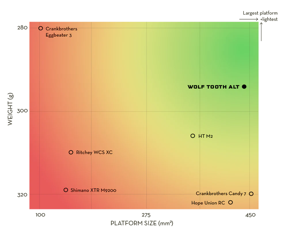 Les Pédales WOLF TOOTH ALT XC Clipless sont conçues pour offrir des performances élevées en cross-country et sur les parcours gravel exigeants. Plus légères et plus fines que la majorité des pédales XC automatiques, elles se distinguent par une hauteur de pile très basse tout en proposant une surface de plateforme élargie. Cette conception améliore la stabilité, le contrôle et le rendement, même sur terrains techniques.